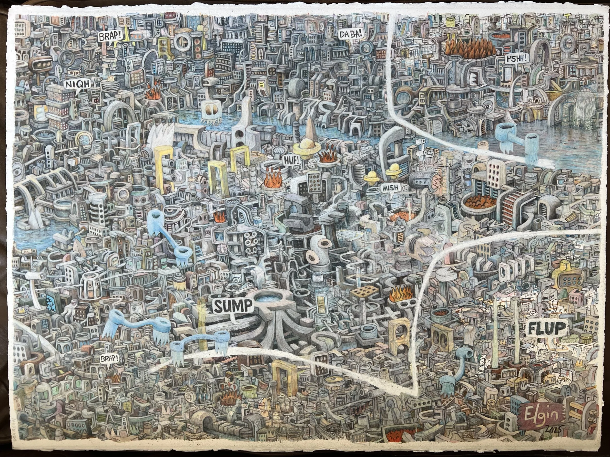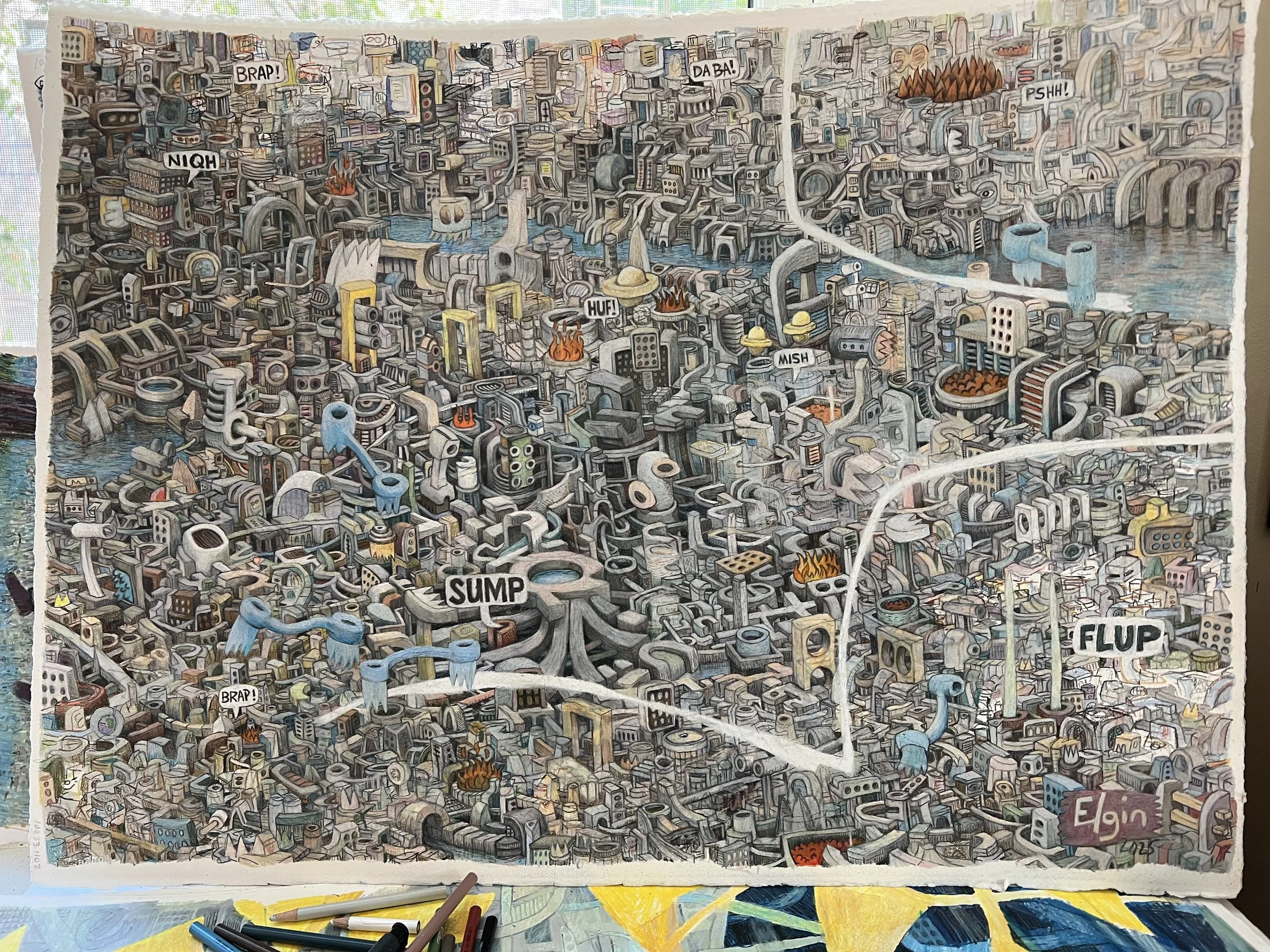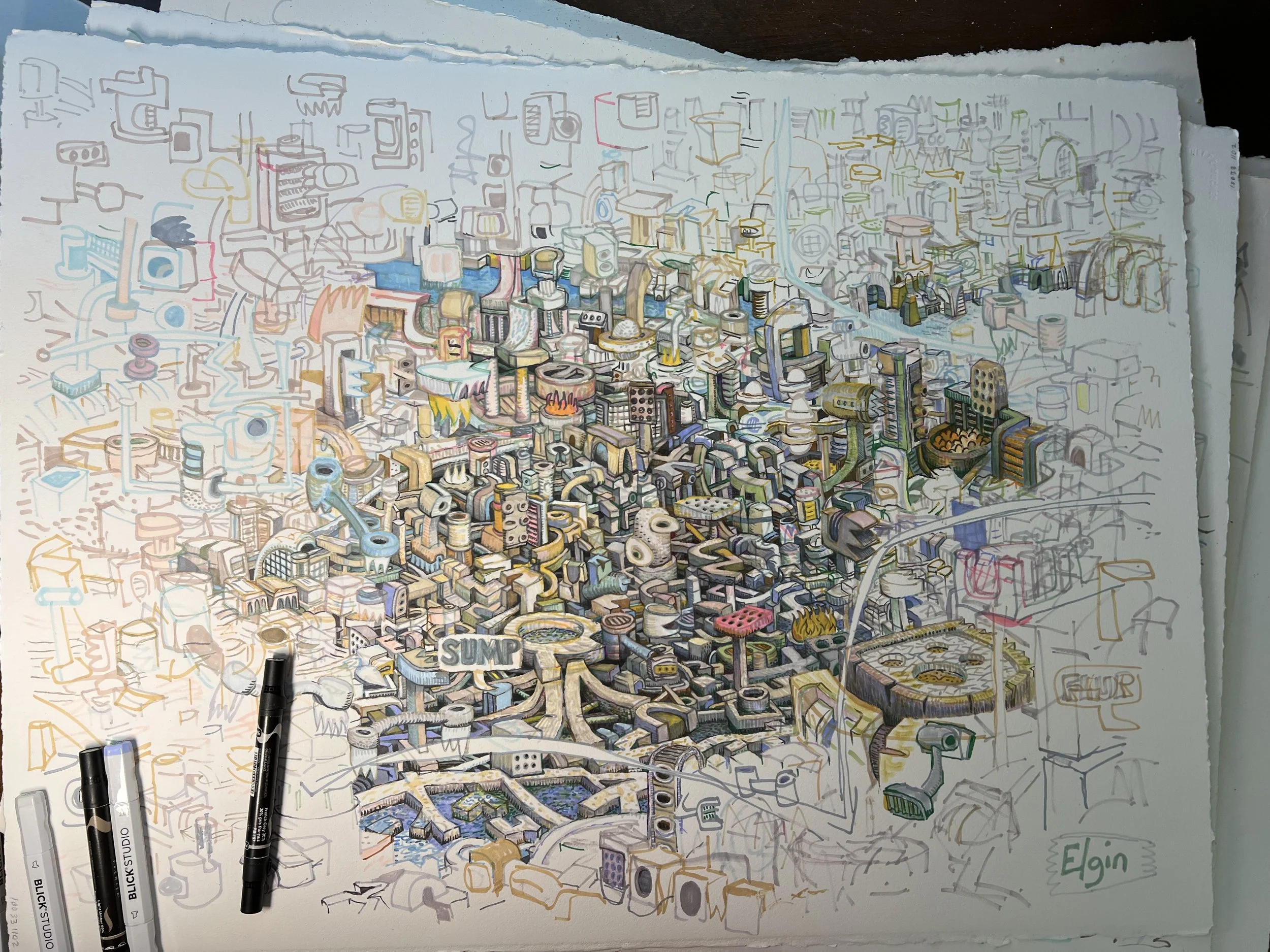 In #1, elements were placed within a loose three-dimensional space. In #2, I introduced gravity as an organizing force. This is not intended as a landscape or cityscape. It is an abstract expressionist framework, but structured through the logic of three-dimensional space and downward force.