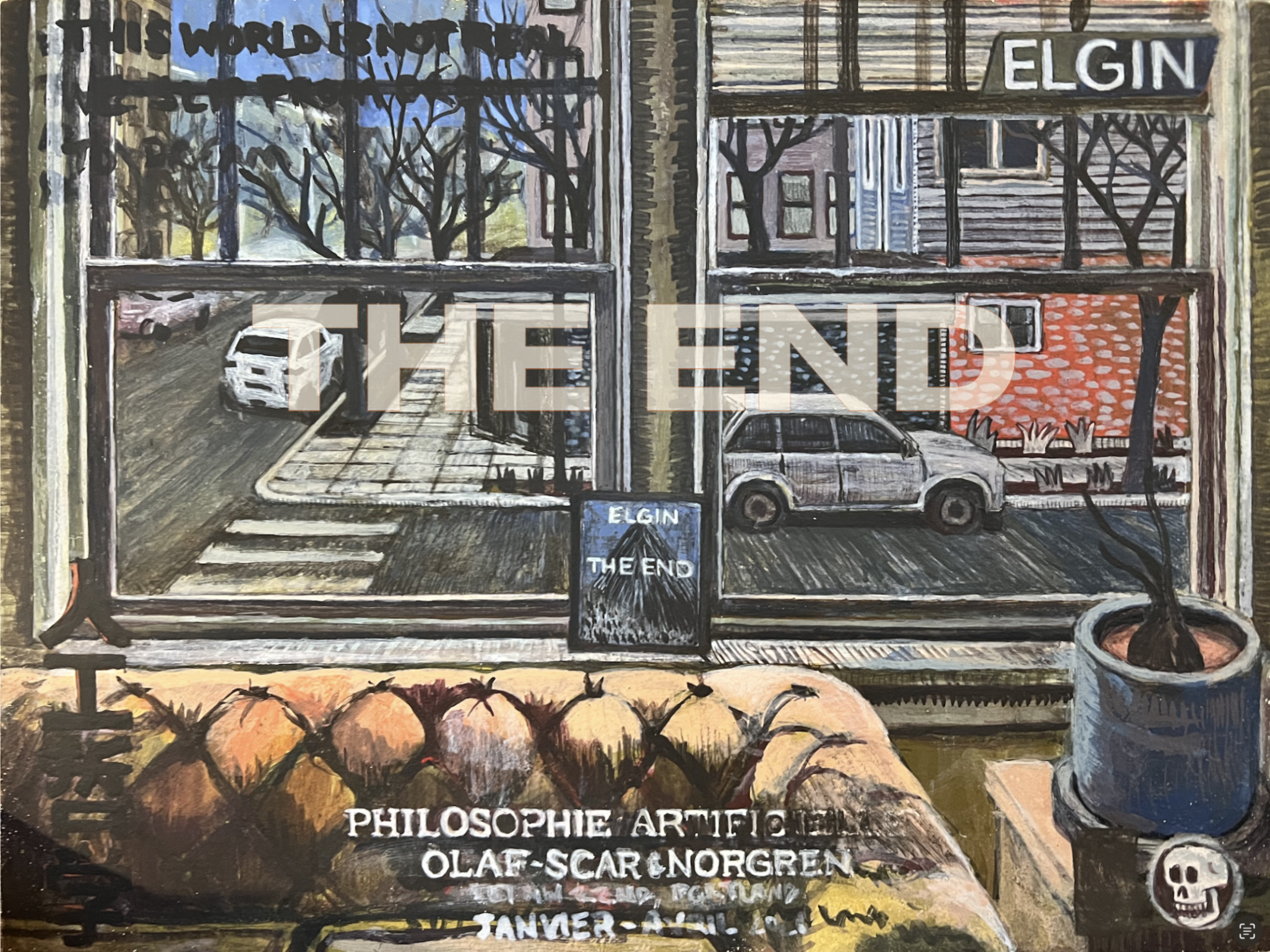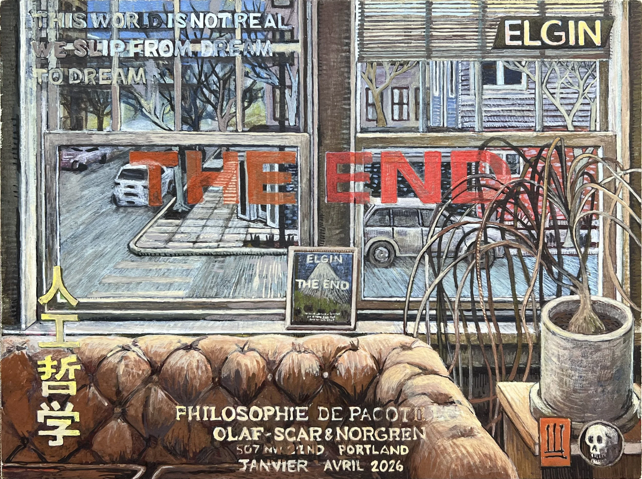 For me, those lines are so filled with hysteria and world destroying realizations that are quickly forgotten. I love the idea that we could be in a dream and we just shift from one dream to another. I want to evolve this thinking. I’m working on pushing the text on a future drawing from stating the fact to acting more like a warning or alert “If you are reading this, understand that you are not real… etc”. For some reason it makes me so happy to think about a fictional person coming into a fictional gallery and seeing this show that is all ‘WARNING’ and ‘ALERT’… the world is not real. Or the idea of a fictional person at a fictional party seeing this weird ass painting on a wall that is saying ‘Pssst… hey, this is not reality your in… wake up’.