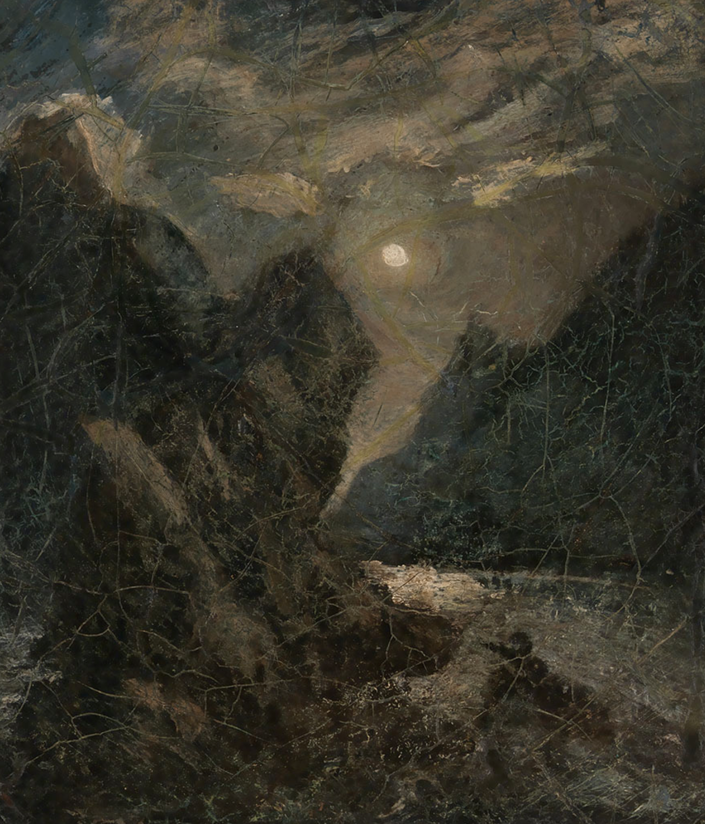 Ryder largely ignored these constraints. He reportedly mixed pigments with varnishes, resins, and oils in unstable combinations, sometimes reworking surfaces long after they had partially set. The result were paintings that materially achieved a unique depth and glow he was after, but at the cost of structural integrity.